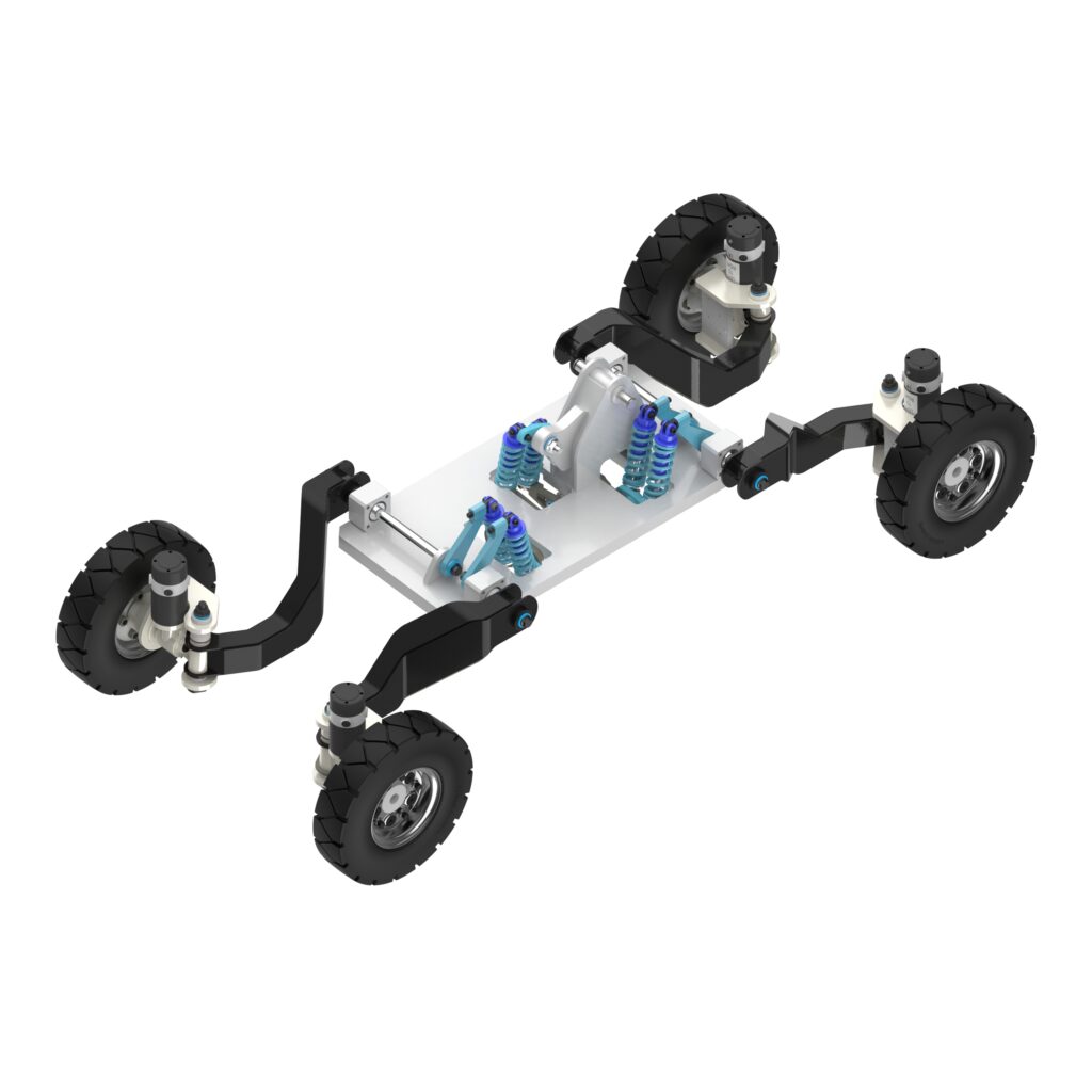 The suspension employs a fully interconnected wheel assembly where all wheels are mechanically linked through an integrated network of rocker arm linkages and shock absorber units, with strategic connection points at the vehicle’s center of gravity. Unlike conventional suspension systems that isolate impact forces to individual wheels, our design distributes shock loads across the entire suspension network.